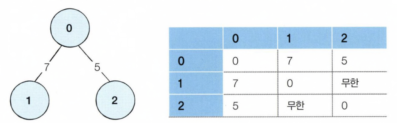 - 아래와 같이 연결된 그래프를 인접 행렬로 표현할 때 파이썬에서는 2차원 리스트로 구현할 수 있다.(연결 되어있지 않은 노드끼리는 무한의 비용이라고 작성한다.)