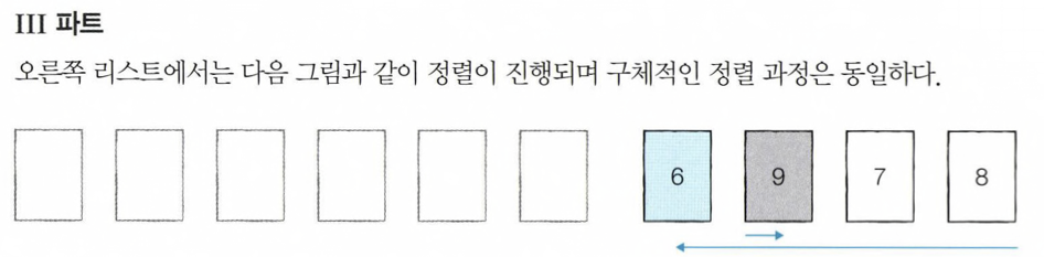 위의 그림을 보면 하늘색으로 칠해진 카드들은 어떤 단계든지 항상 정렬된 상태를 유지한다. 이러한 특징 때문에 삽입 정렬에서는 특정하 ㄴ데이터가 삽입될 위치를 선정할 때(삽입된 위치를 찾기 위하여 왼쪽으로 한 칸씩 이동할 때), 삽입될 데이터보다 작은 데이터를 만나면 그 위치에서 멈추면 된다.