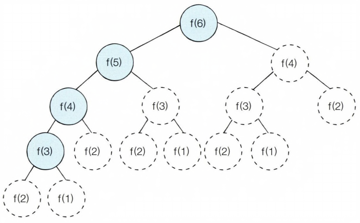 그림을 보면 f(6)을 호출했을때 동일한 함수가 반복적으로 호출되는것을 할 수 있다. 이미 한 번 계산했지만, 계속 호출할 때마다 계산하는 것이다. 그림에서 f(3)은 3번 호출되었다. 즉, f(n)에서 n이 커지면 커질수록 반복해서 호출하는 수가 많아진다.