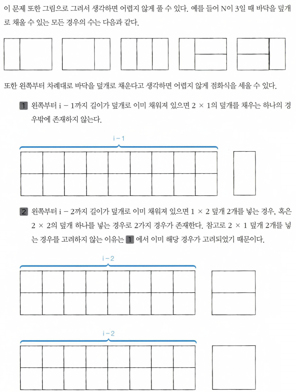 이 풀이는 이코테 책에서 알려준 풀이이다. 이렇게 그림으로 보고 맨 마지막일때부터 상황을 보는것이 점화식을 세우는데 도움이 되는것 같다.