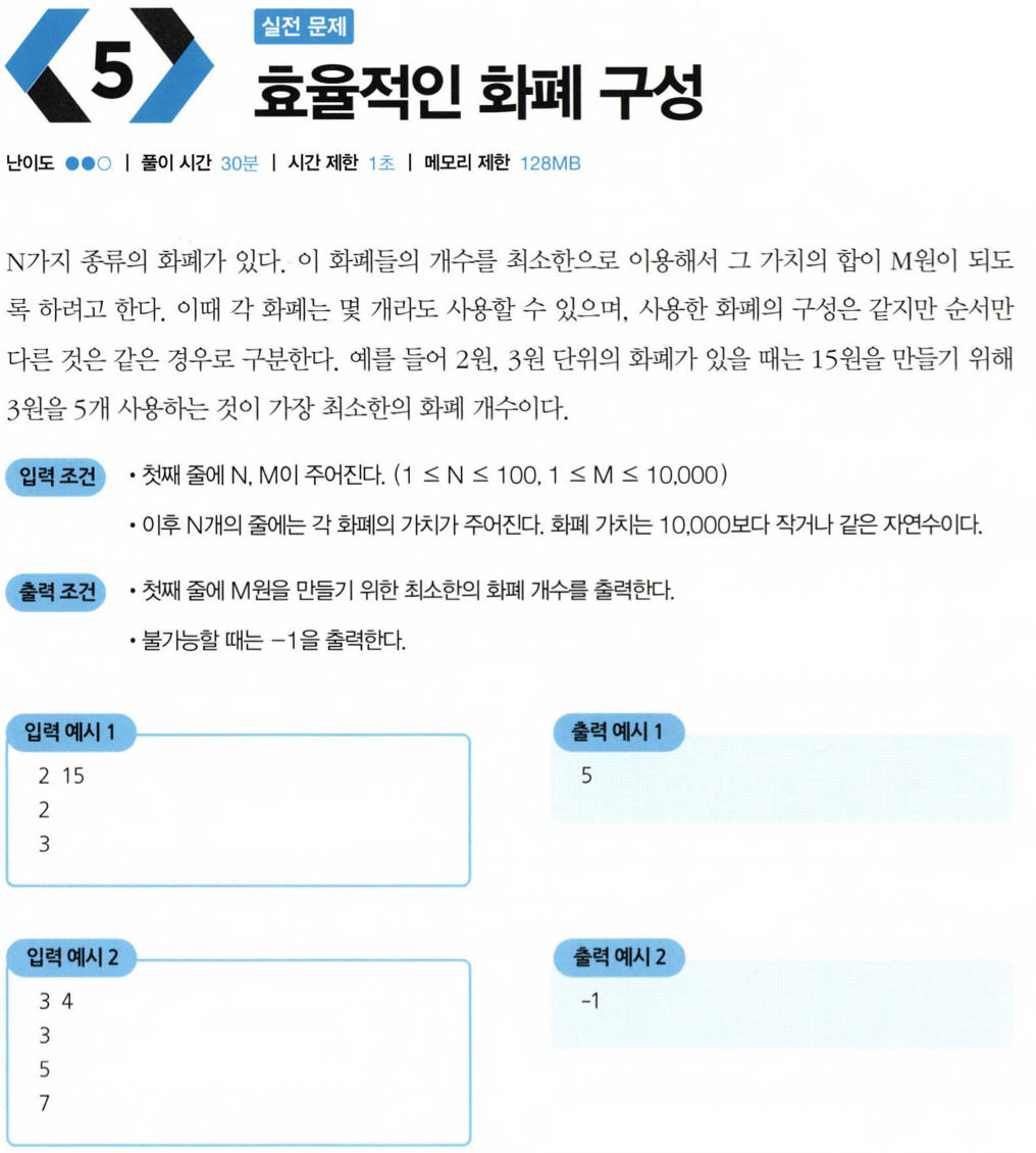 이건 이코테 책에 나온 문제 풀이방법인데, 일단 화폐단위 대로 반복문을 돌려야한다는 사실은 파악했었다! 그리고 캐시에서 각 인덱스를 금액으로 설정하여 진행해야겠다는 생각도 할 수 있었다. 하지만 결국 내가 또 중간에 막힌 이유는,,,