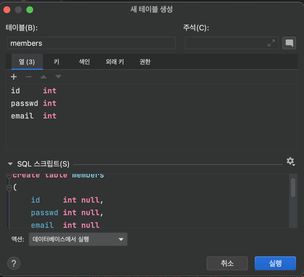 저곳에서 테이블의 속성을 수정하고 실행버튼을 누르면 이제 members에 있는 빨간글자가 제대로 돌아온것을 확인할 수 있을것이다.
