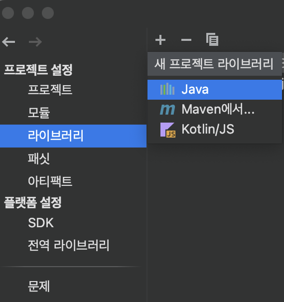 4. 이클립스 상단에 파일->프로젝트구조->라이브버리로 들어가서 + 버튼을 눌러 Java 탭을 클릭한다. 그리고 위의 경로에 있는 jar 파일을 선택하여 추가한다.