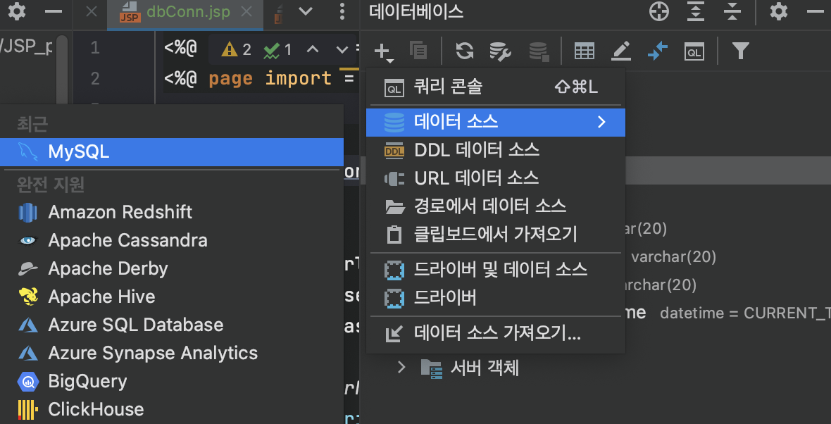 4. 자 이제 서버에서 자동으로 데이터베이스를 연동해주는 코드를 짜봅시다. (인터넷으로 검색해보니, Java Spring의 경우 자바파일에 어노테이션을 붙여서 작성하던데, 저희 수업 프로젝트에서는 연동코드도 jsp로 작성했기 때문에,, 저도 jsp 코드로 작성해보았습니다.)