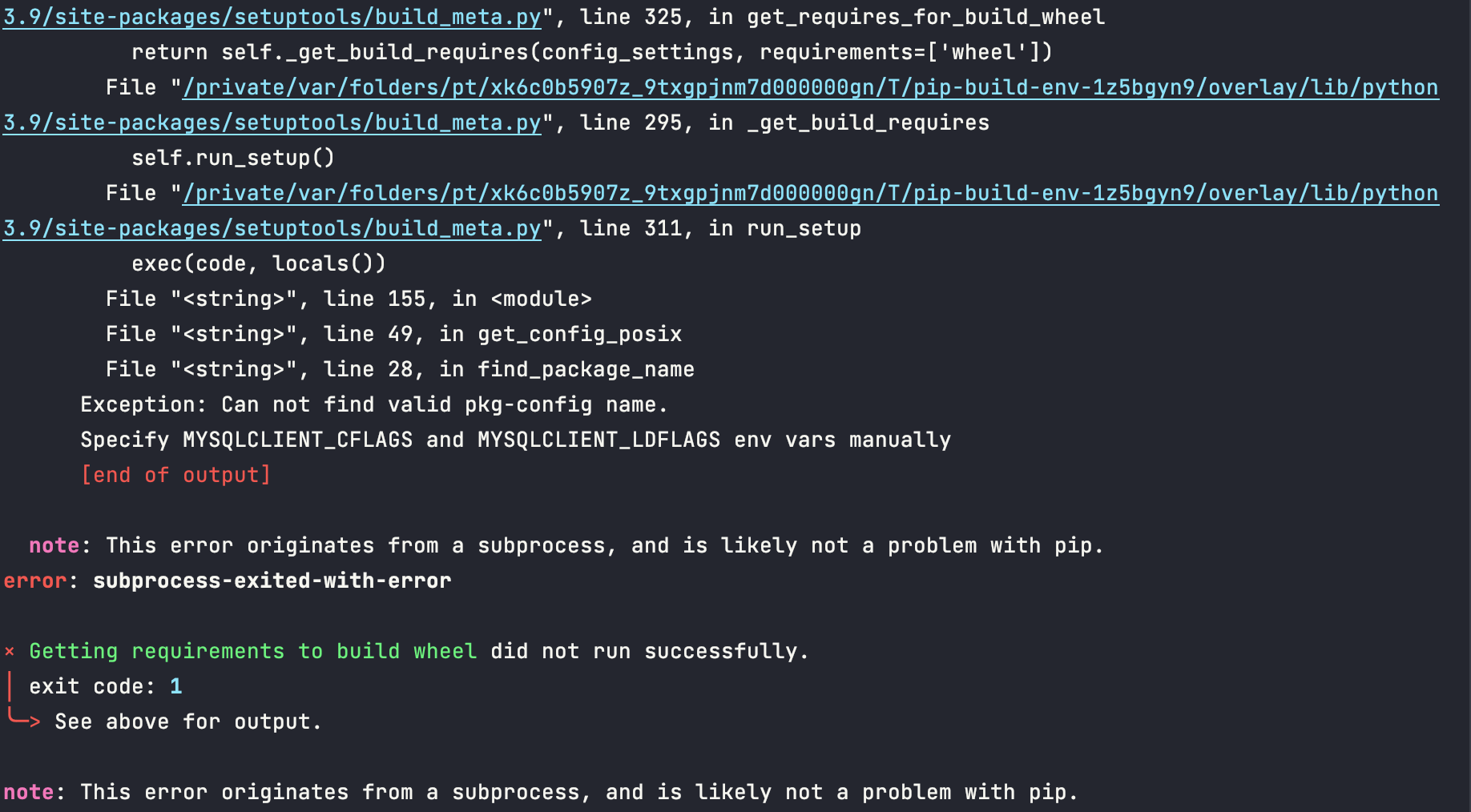 × Getting requirements to build wheel did not run successfully.