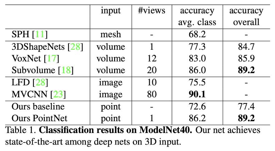 <Table 1> ์ ๋ณด๋ฉด 3D ์ ๋ ฅ(mesh, volume, point) ์ ๊ธฐ๋ฐ์ผ๋ก ํ ๋ฐฉ๋ฒ๋ค ์ค์์๋ Ours PointNet ์ด ์ต๊ณ ์ ์ฑ๋ฅ(89.2) ์ ๋ณด์์ง๋ง, ๋ค์ค ๋ทฐ ๊ธฐ๋ฐ ๋ฐฉ๋ฒ(MVCNN) ์ ๋นํด์๋ ์ฝ๊ฐ ๋ค์ฒ์ง๋ค. ๊ทธ ์ด์ ๋ ๋ค์ค ๋ทฐ ๋ ๋๋ง ์ด๋ฏธ์ง๊ฐ ํฌ์ธํธ ํด๋ผ์ฐ๋์์ ๋์น ์ ์๋ ์ธ๋ถ์ ์ด ๊ธฐํํ์ ์ ๋ณด๋ฅผ ๋ ์ ํฌ์ฐฉํ ์ ์๊ธฐ ๋๋ฌธ์ด๋ผ๊ณ ํ๋จ๋๋ค.