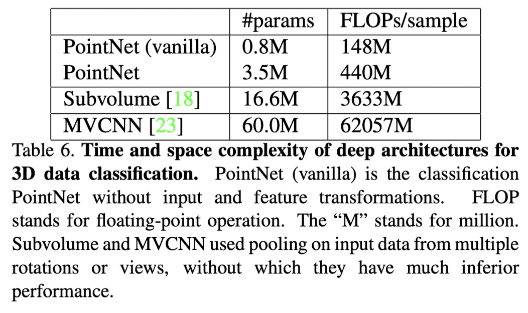 <Table 6>์ Classification ์ฉ PointNet์ Space(๋คํธ์ํฌ์ ํ๋ผ๋ฏธํฐ ์)๊ณผ Time(์ํ๋น ๋ถ๋์์์ ์ฐ์ฐ, FLOP) ๋ณต์ก๋๋ฅผ ์์ฝํ๋ค.