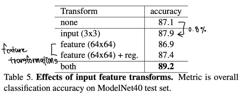 <Table 5>์์ ์ด ๋ ผ๋ฌธ์ ์ ๋ ฅ ๋ฐ ํน์ง ๋ณํ(input and feature transfomation,์ ๋ ฌ์ ์ํ)์ด ์ฑ๋ฅ์ ๋ฏธ์น๋ ๊ธ์ ์ ์ธ ์ํฅ์ ๋ณผ ์ ์๋ค. ๊ธฐ๋ณธ์ ์ธ ์ํคํ ์ฒ๋ง์ผ๋ก๋ ๊ฝค ๋ง์กฑ์ค๋ฌ์ด ๊ฒฐ๊ณผ๋ฅผ ์ป์ ์ ์๋ค๋ ์ ์ด ๋งค์ฐ ํฅ๋ฏธ๋กญ๋ค. ์ ๋ ฅ ๋ณํ(input 3x3)์ ์ฌ์ฉํ๋ฉด ์ฑ๋ฅ์ด 0.8% ํฅ์๋๋ค. ๊ณ ์ฐจ์ ๋ณํ์ด ํจ๊ณผ์ ์ผ๋ก ์๋ํ๊ธฐ ์ํด์๋ ์ ๊ทํ ์์ค(Regularization loss)* ์ด ํ์ํ๋ค. ๋ ๋ณํ๊ณผ ์ ๊ทํ ํญ์ ๊ฒฐํฉํจ์ผ๋ก์จ ์ต๊ณ ์ ์ฑ๋ฅ์ ๋ฌ์ฑํ ์ ์์๋ค.