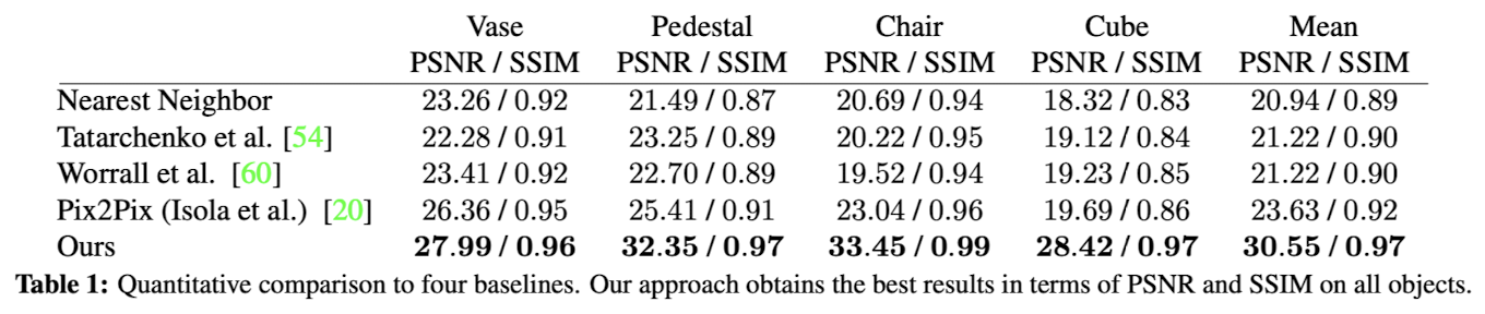 - ํ์ต์กฐ๊ฑด: ๋ชจ๋ ๋ชจ๋ธ์ ๋์ผํ ์์ค ํจ์๋ฅผ ์ฌ์ฉํด ์๋ ดํ ๋๊น์ง ํ์ต, ์ ๋ ฅ ๋ฐ์ดํฐ๋ DeepVoxels ์ ๋์ผ