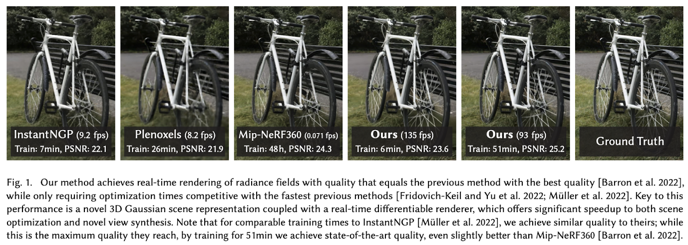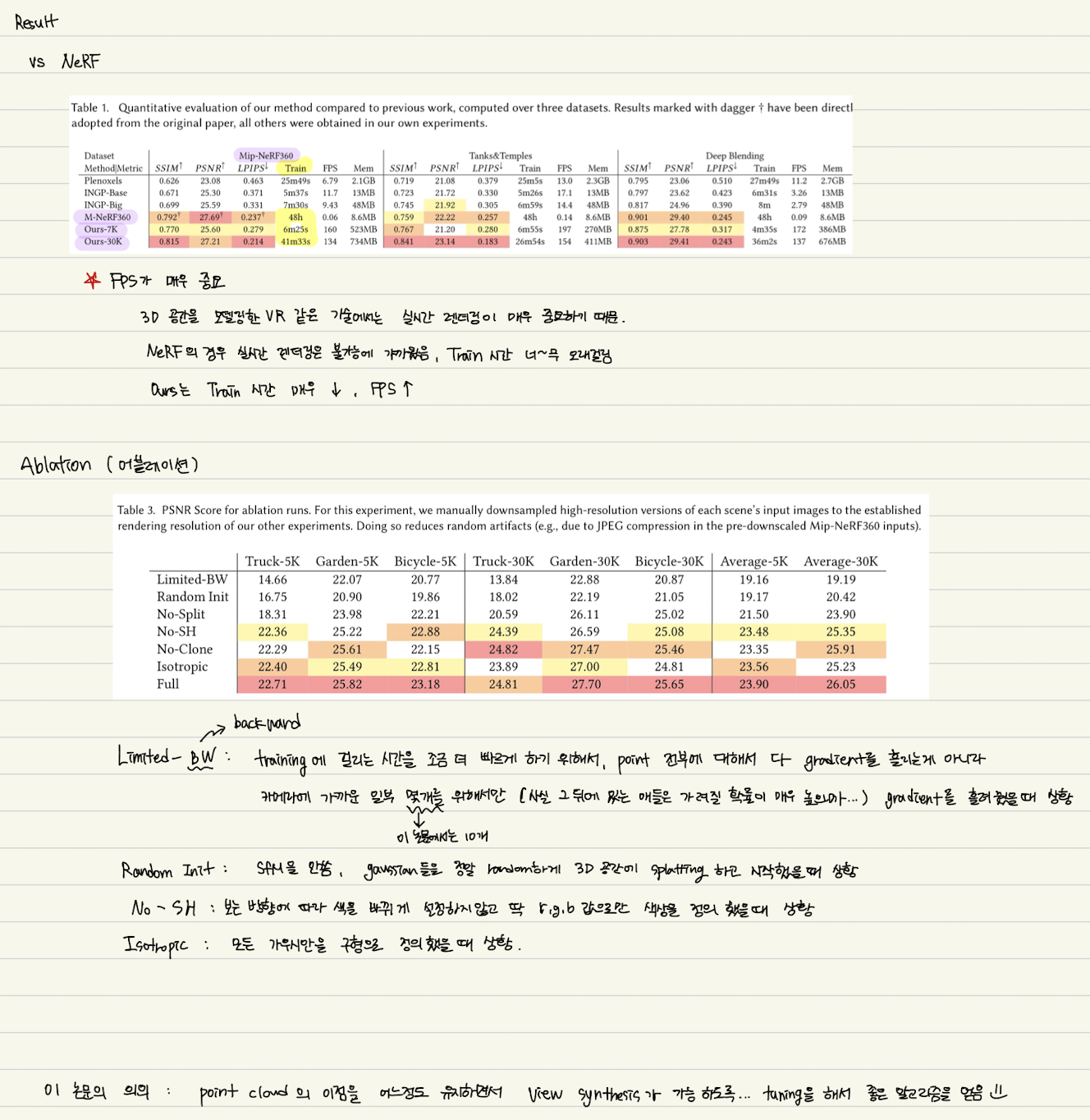 - ๊ธฐ์กด SOTA ๋ฐฉ๋ฒ(Min-NeRF360)์ ๋์ ํ์ง์ ์ ๊ณตํ์ง๋ง ์ต๋ 48 ์๊ฐ์ ํ์ต ์๊ฐ์ด ํ์ํ๋ค.
