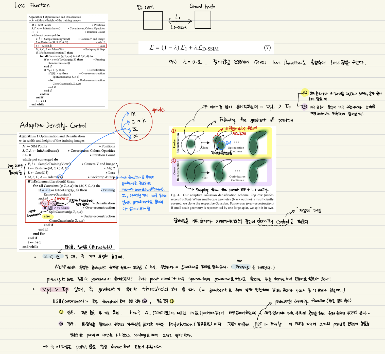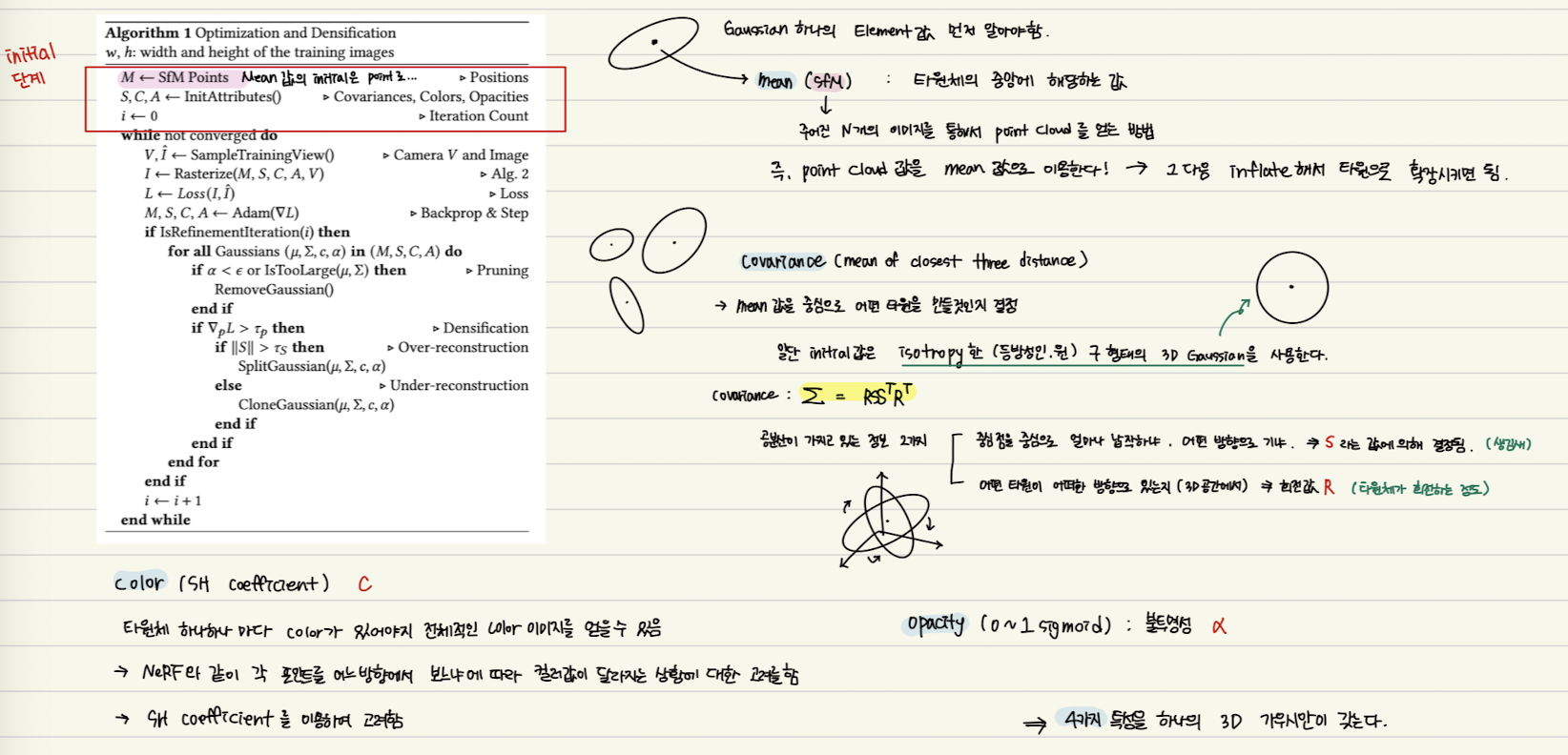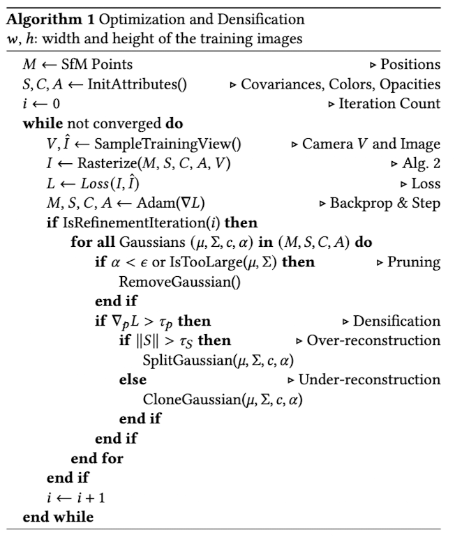 ์๊ณ ๋ฆฌ์ฆ์ 3D ๊ฐ์ฐ์์ parameter(์์น, ๊ณต๋ถ์ฐ, ๐ผ, SH ๊ณ์)์ ์ต์ ํ์ ๊ฐ์ฐ์์ ๋ฐ๋์ ์ ์์ ์ ์ด๋ฅผ ๋ฐ๋ณต์ ์ผ๋ก ์ํํ์ฌ ๋ฐฉ์ฌ ํ๋ ํํ์ ์์ฑํ๋ค.