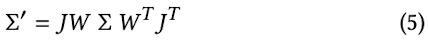 : 3D ๊ณต๋ถ์ฐ Σ๋ฅผ ์นด๋ฉ๋ผ ์ขํ๊ณ๋ก ๋ณํํ Σ′๋ ๋ค์๊ณผ ๊ฐ์ด ๊ตฌํ๋ค.