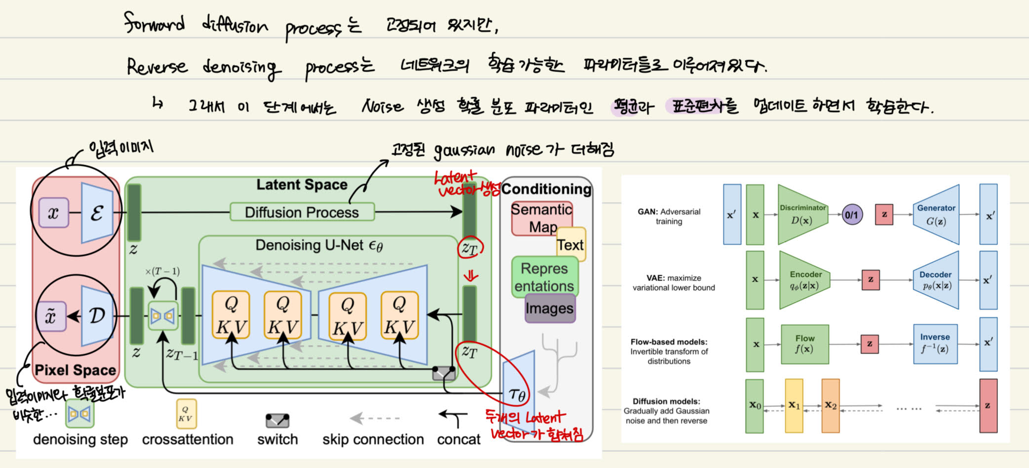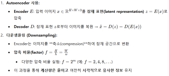 - ์ ์ฌ ๊ณต๊ฐ(latent space)์์ Diffusion Models๋ฅผ ํ์ตํ์ฌ
