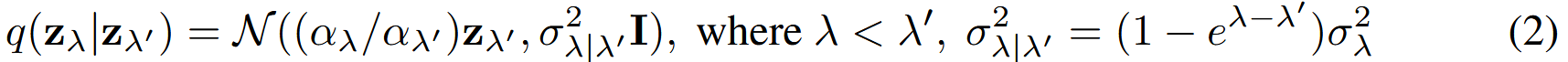 - q(zλ′โโฃzλโ): ์๊ฐ λ ๋จ๊ณ์ ๋ ธ์ด์ฆ ๋ฐ์ดํฐ zλโ ์์ ๋ ๋ง์ ๋ ธ์ด์ฆ๋ฅผ ์ถ๊ฐํ์ฌ ๋ค์ ๋จ๊ณ λ′ ์ ๋ฐ์ดํฐ zλ′ ๋ก ์ ํํ๋ ํ๋ฅ ๋ถํฌ