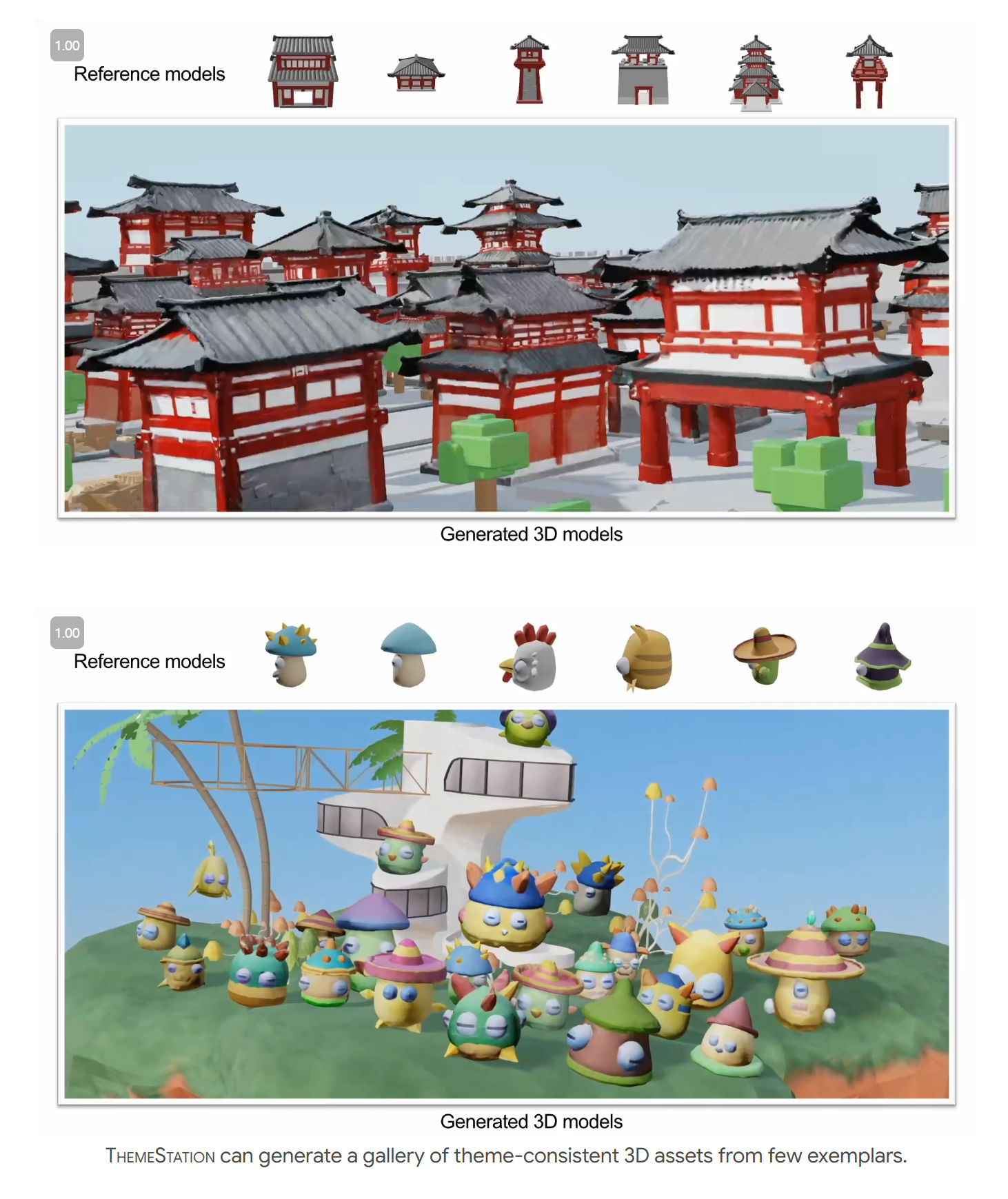 ThemeStation ์์๋ ์ ๋ ฅ๋ ๋ช ๊ฐ์ 3D ์์ (Examplars) ๋ฅผ ๊ธฐ๋ฐ์ผ๋ก ์๋ก์ด 3D ์์ ์ ์์ฑํ๋๋ฐ, ๋๊ฐ์ง ๋ชฉํ๋ฅผ ๊ฐ์ง๊ณ ์์ต๋๋ค.