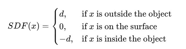- SDF ๋ ๊ณต๊ฐ์ ํ ์ x ๊ฐ ๋ฌผ์ฒด ํ๋ฉด์ผ๋ก๋ถํฐ ์ผ๋ง๋ ๋จ์ด์ ธ ์๋์ง๋ฅผ ๋ํ๋ด๋ ํจ์