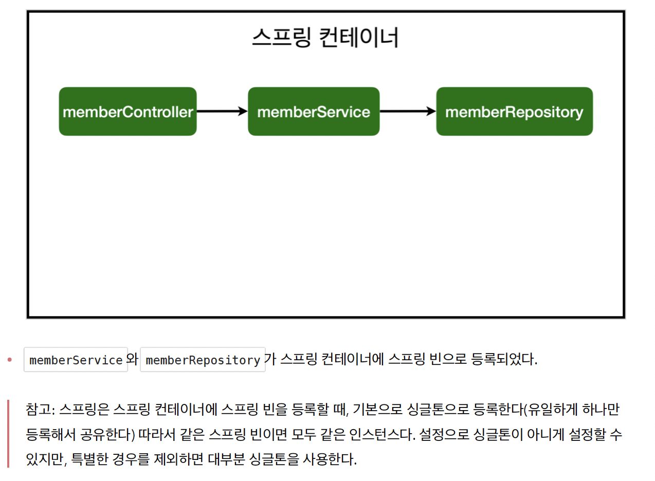 - 생성자에 @Autowired 가 있으면 스프링이 연관된 객체를 스프링 컨테이너에서 찾아서 넣어준다. 이렇게 객체 의존관계를 외부에서 넣어주는 것을 DI (Dependency Injection), 의존성 주입이라 한다.