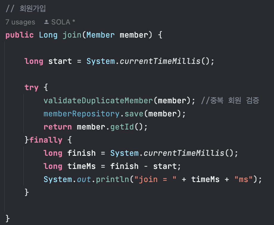 - 시간을 측정하는 로직과 핵심 비즈니스의 로직이 섞여서 유지보수가 어렵다.