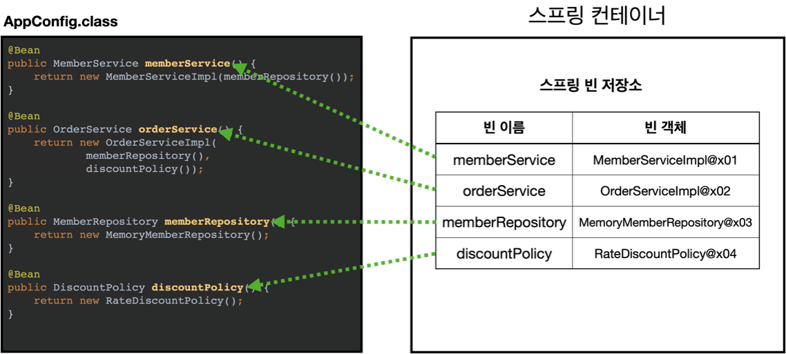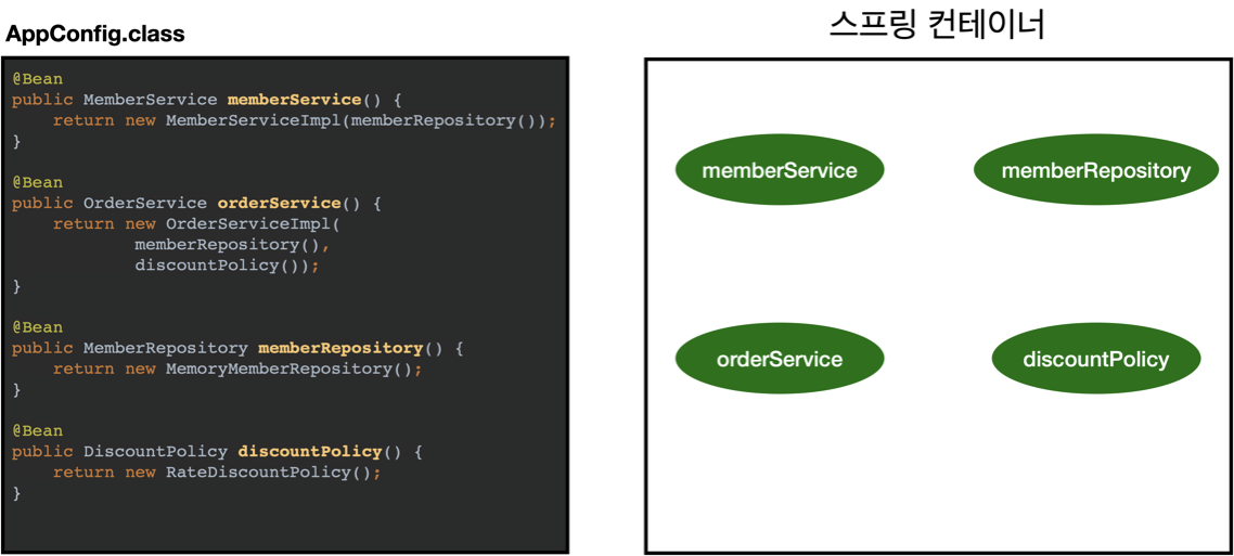 - 스프링 컨테이너는 파라미터로 넘어온 설정 클래스 정보를 사용해서 스프링 빈을 등록한다.