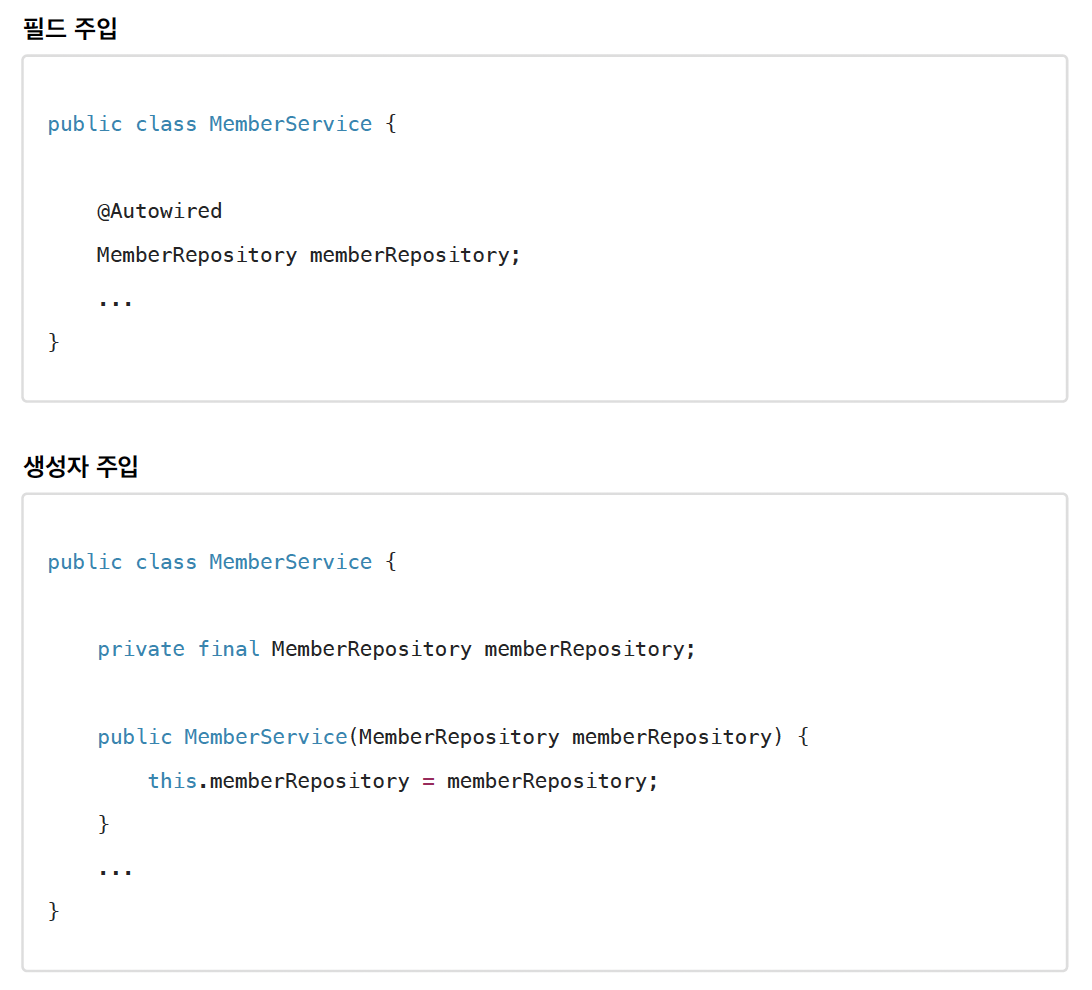 - final 키워드를 추가하면 컴파일 시점에 memberRepository를 설정하지 않는 오류를 체크할 수 있다. (보통 기본 생성자를 추가할 때 발견)
