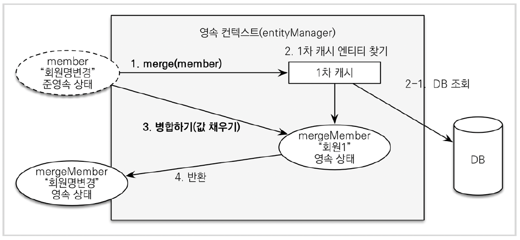 주의: 변경 감지 기능을 사용하면 원하는 속성만 선택해서 변경할 수 있지만, 병합을 사용하면 모든 속성이 변경된다. 병합시 값이 없으면 null 로 업데이트 할 위험도 있다. (병합은 모든 필드를 교체한다.)