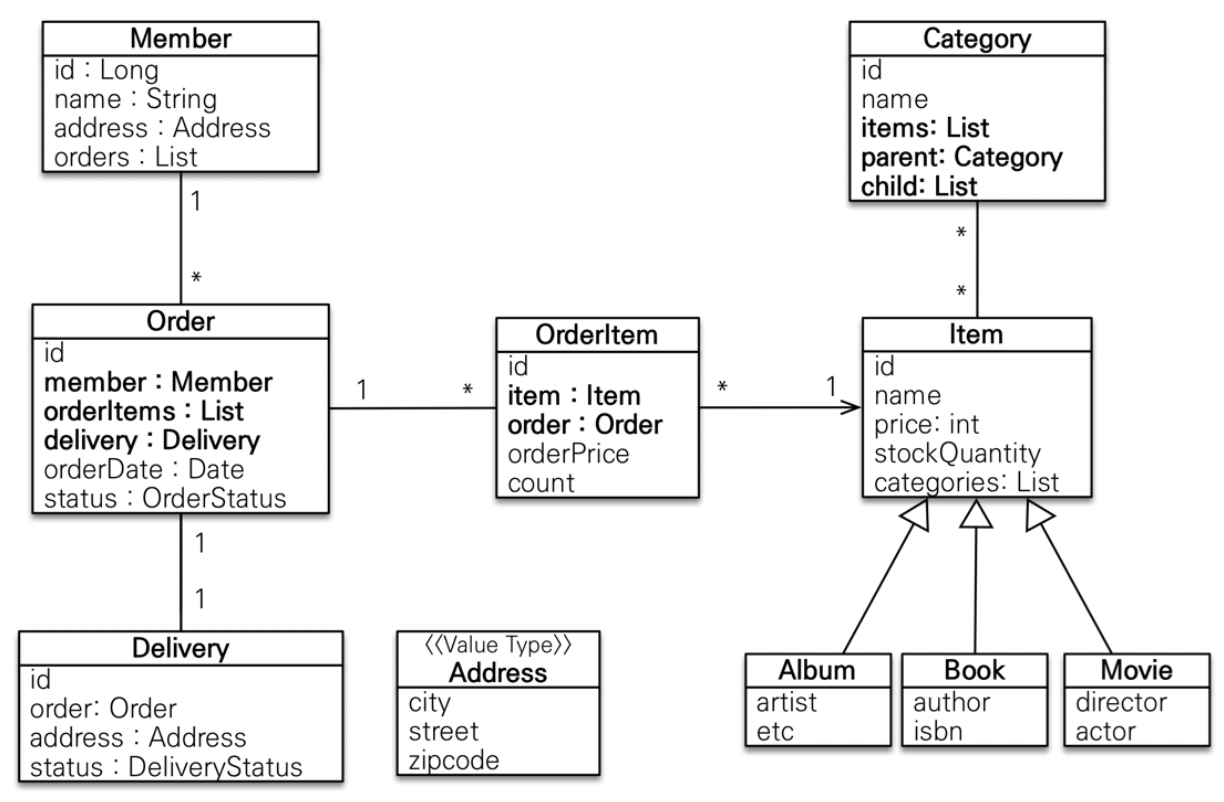 주소(Address): 값 타입(임베디드 타입)이다. 회원과 배송(Delivery)에서 사용한다.