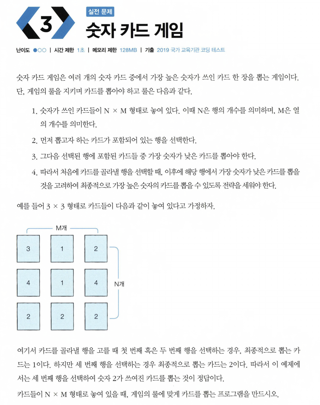 이 문제를 푸는 아이디어는 바로 '각 행마다 가장 작은 수를 찾은 뒤에 그 수 중에서 가장 큰수'를 찾는 것이다.